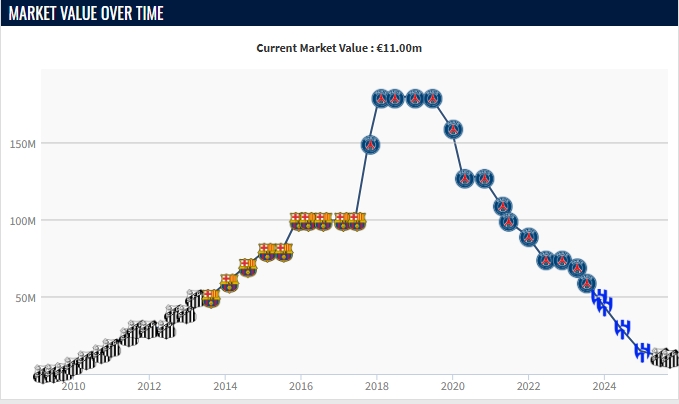 其职业生涯最高身价出现在2018-2019赛季,当时估值高达1.8亿欧元。近两年来,内马尔身价已累计下跌4900万欧元。